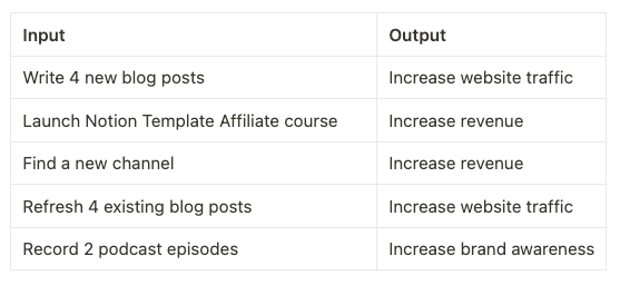 I’m breaking my tasks each month into inputs and marking what types of output they drive.