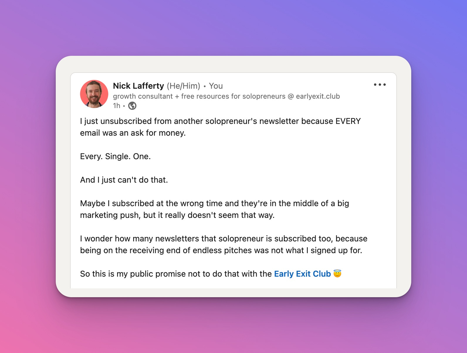 You’re reading Early Exit Club — a newsletter about leaving the 9-5 workforce to build a $20k/month solo business by Nick Lafferty.