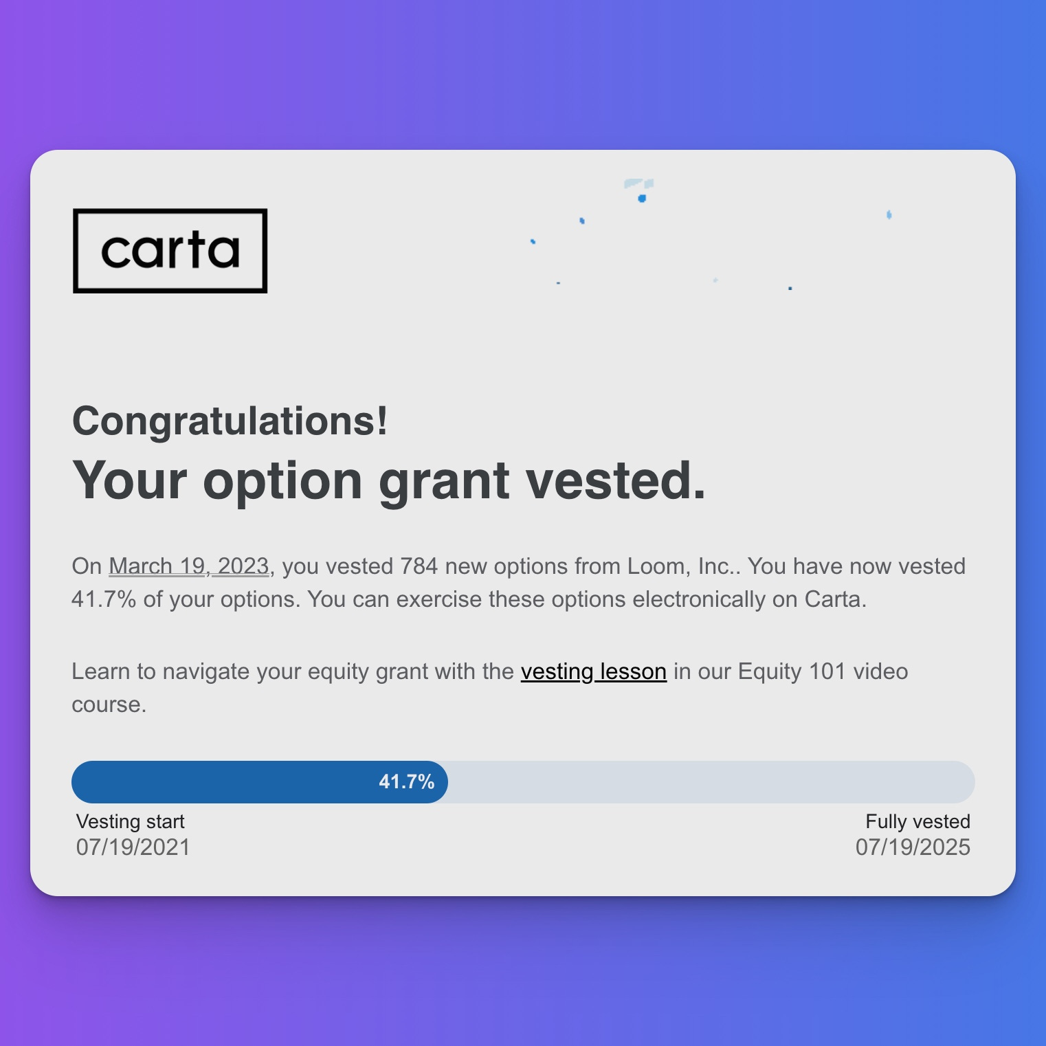 After I hit my vesting cliff, I’d get emails like this every month from Carta (the company Loom used to manage their option pool).