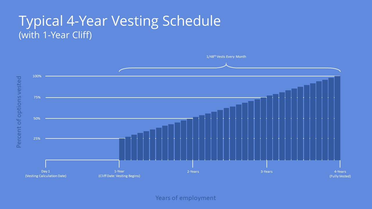 A vesting schedule is a pre-determined amount of time where you actually earn your initial equity grant.