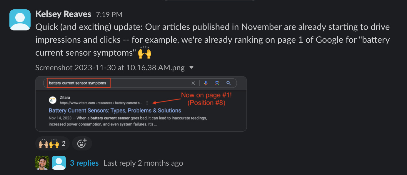 For most of my clients, I’m on a shared Slack channel where I can highlight achievements beyond monthly reports. So instead of solely relying on statistics like "traffic increased by X%," I emphasize tangible wins by sharing screenshots. It’s WAY more impactful to see results in the real world, versus just seeing numbers. Not only does it help keep clients engaged, but it keeps our work at the top of their minds.