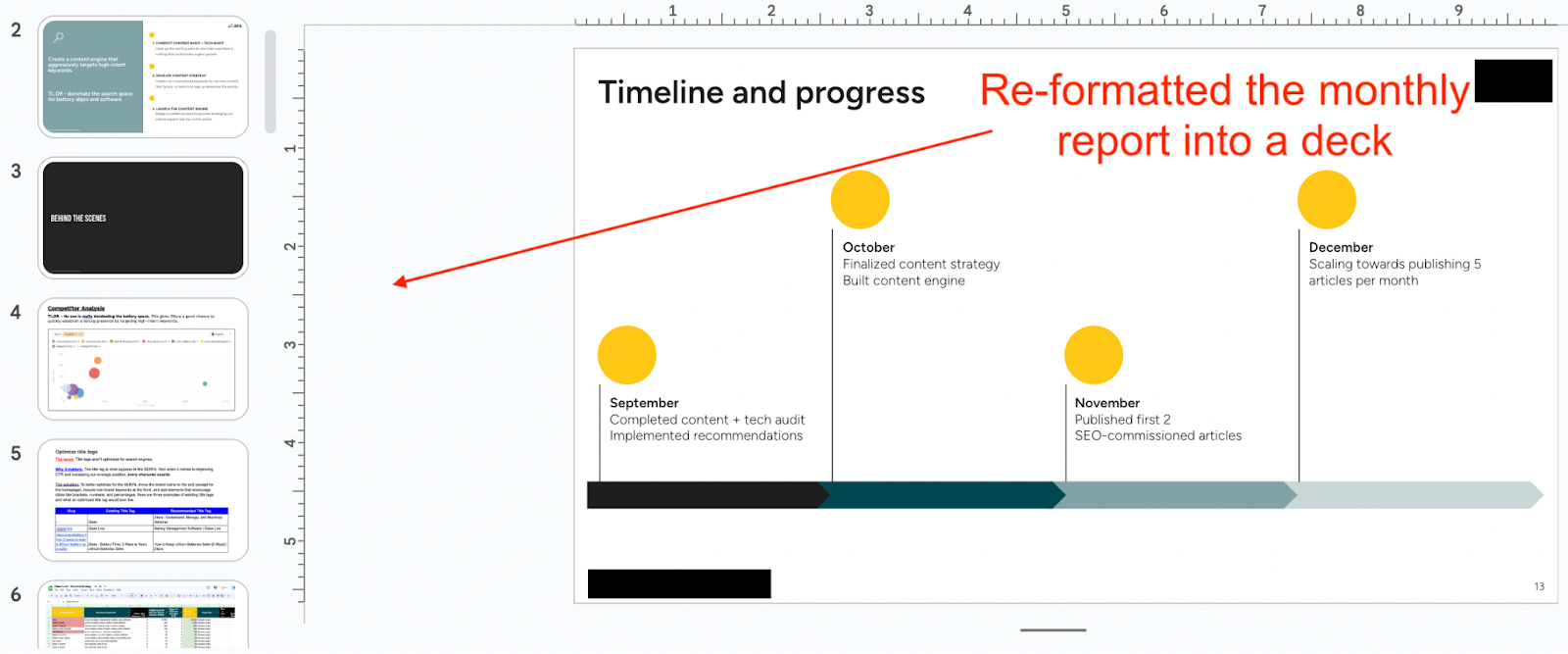 Rather than sending the usual monthly report I put together in a Google Doc, I transformed the strategy and key insights into a presentation deck that he could share with the CEO: