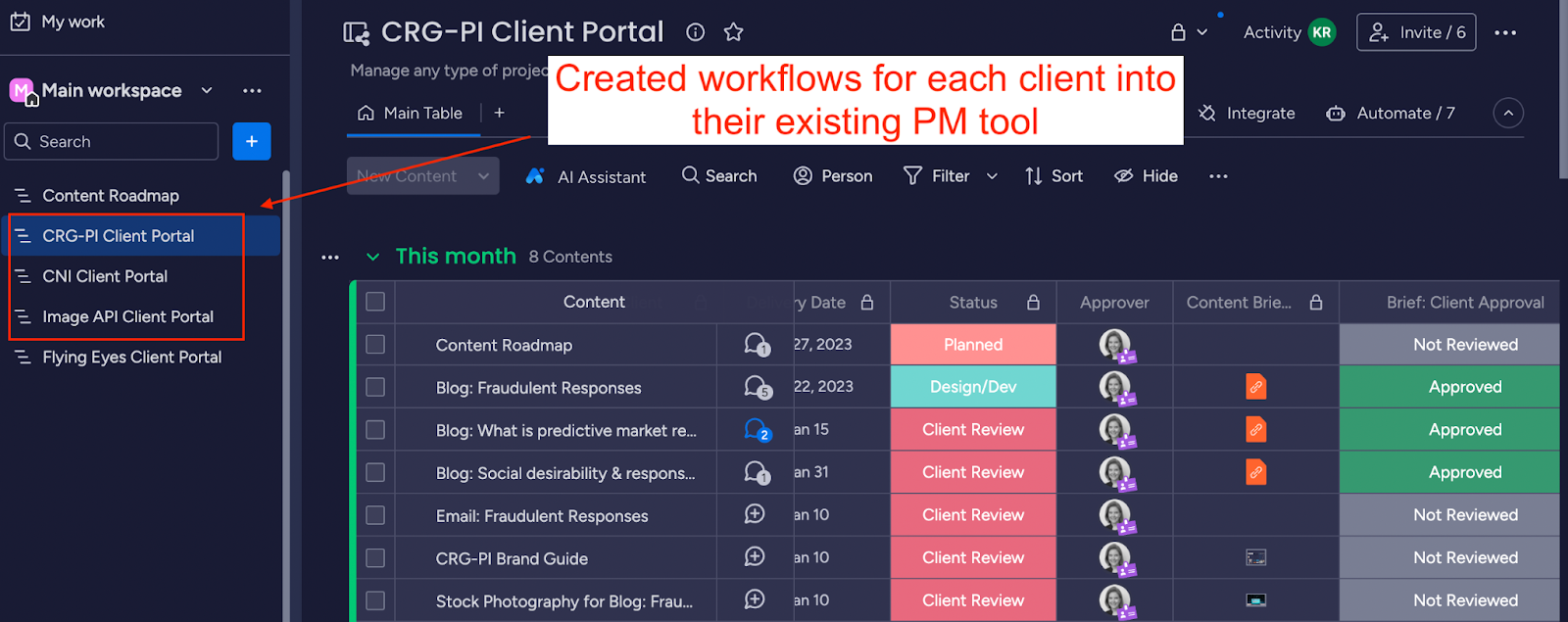 If they use Asana, then it's easy. I’ll just build out a workflow for SEO tasks into their existing account. Airtable? Cool, I’ll move my Excel spreadsheet over. Monday? No sweat. I’ll create a new board for my deliverables.