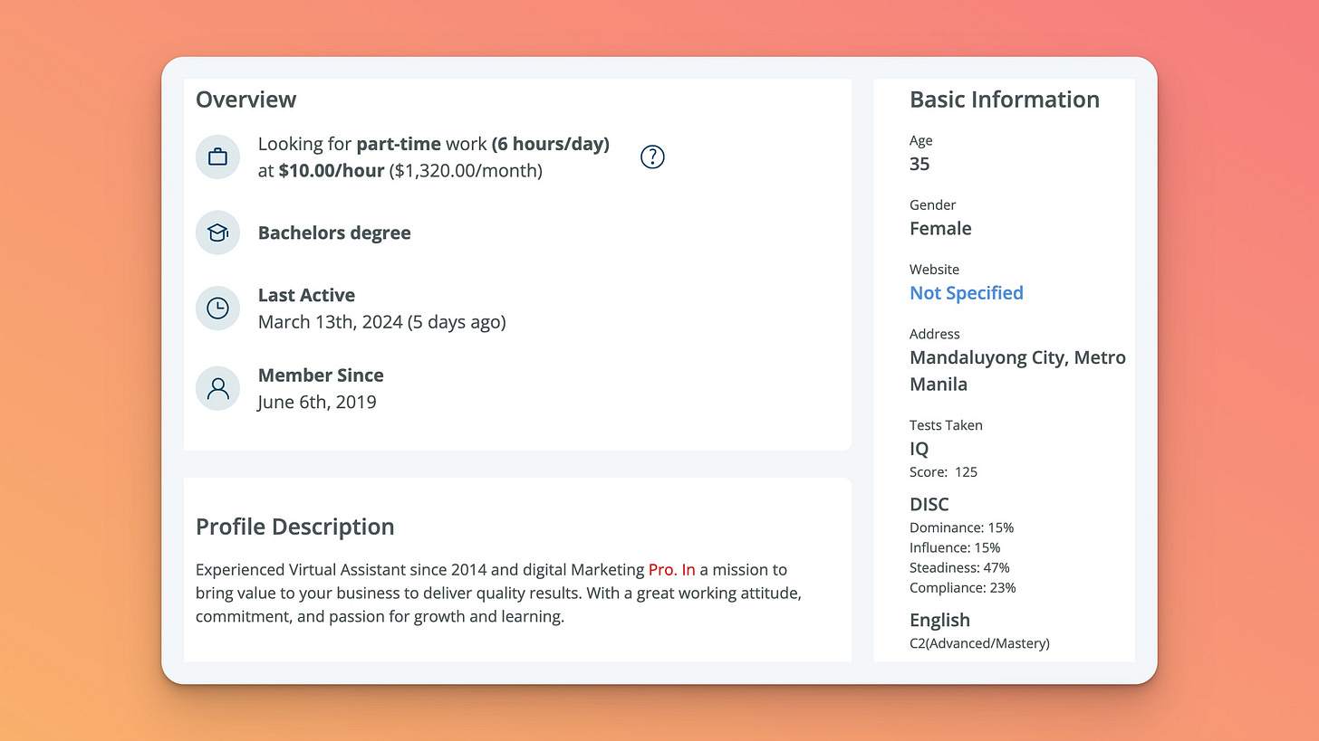 I liked this option the best because I could take my time and look for VAs who had what I was looking for: digital marketing experience.
