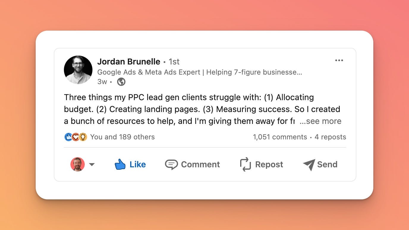 Just ask Jordan Brunelle. Jordan is a PPC consultant who released a free product called the Ultimate PPC Lead Generation Playbook on LinkedIn. He received over 1,000 comments from people asking for access.