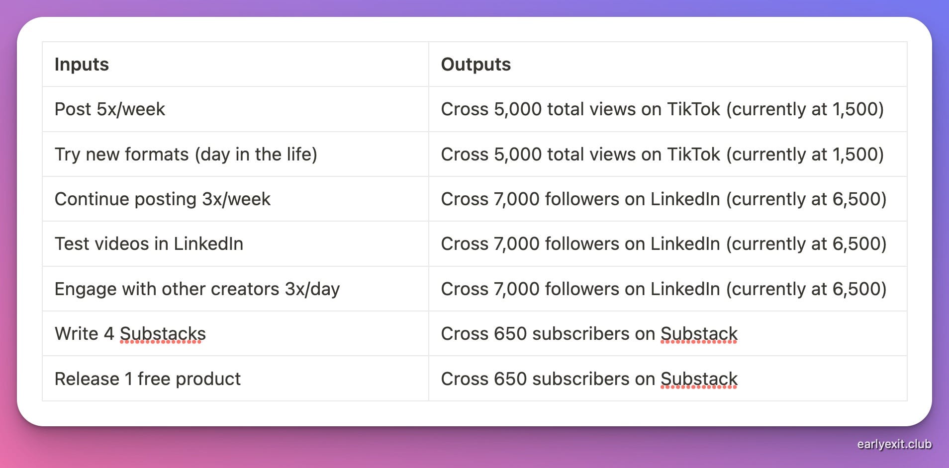 Outputs are the goals I want to achieve and the inputs are the work that goes into achieving those goals.