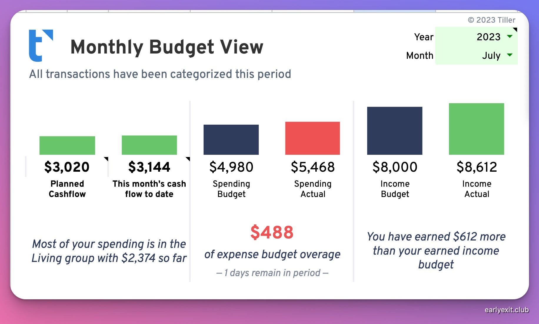 As a reminder, this shows my monthly budget compared to the monthly actuals for both income and spending.